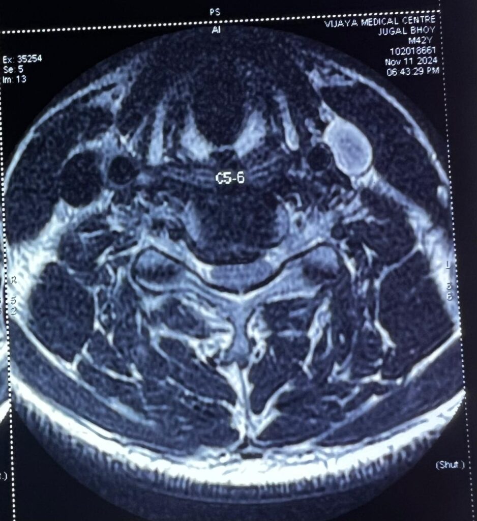 The scan showed disc prolapse at the C4-5 and C5-6 levels, with severe compression of the spinal cord. The paralysis of his right hand and leg was due to this compression. A diagnosis Cervical Myelopathy was made , and as the patient was rapidly deteriorating, surgery was advised. The patient was taken up for surgery after a detailed discussion with his family regarding the risks, benefits and possible outcomes. Surgery (Anterior Cervical Discectomy and Fusion (ACDF) was done at C4-5 and C5-6 levels.